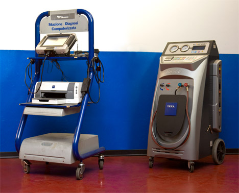 Siamo dotati anche di una stazione di servizio per la ricarica degli impianti di climatizzazione di veicoli, controllo eventuali perdite con ricerca UVA e possibilità di trattamento igenizzante dell'abitacolo.